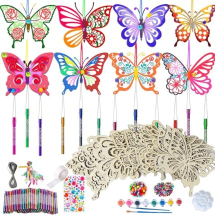 174-piece wooden butterfly wind chime craft kit for children, wooden butterfly pendants for painting with flower patterns, bell, rhinestones, for Easter